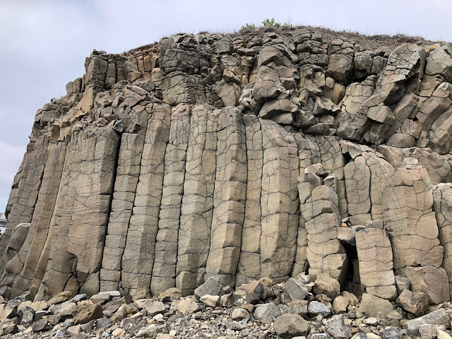 去參觀巨大玄武岩柱是我此趟澎湖行最想看的項目,果然不出所望,導遊先生帶我們參觀「池西柱狀玄武岩」(又名池西岩瀑),這是著名的巨大桶狀玄武岩,它的岩石彎曲節理構造,使它看來如同萬馬奔騰的瀑布水流般奔流入大海而得名,山崖下有格狀的已廢棄九孔石滬,石滬上長滿了翠綠的青苔,與前端蔚藍的海水相映成趣,此時此際觀看岩瀑、石滬、海水相偎相依的景緻,使人頓覺心曠神怡。附近有另一個景點「小池角雙曲橋」,T字型的雙曲橋往海裡伸展,退潮時還能見到大片的潮間帶岩盤,這兒景色十分幽美,非常適合打卡和拍照。